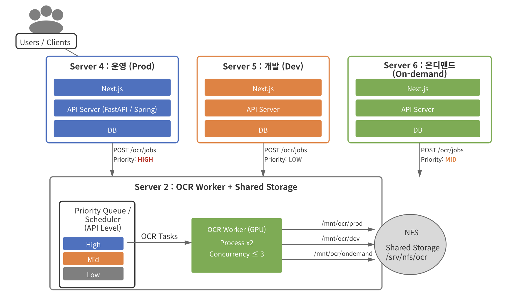 다만 여기서 또 하나의 문제가 발생합니다. 운영 서버, 개발 서버, 온디맨드 서버 세 곳의 모든 OCR 요청이 하나의 서버로 몰리게 되면, 요청 처리 지연이 발생할 수밖에 없다는 점입니다.