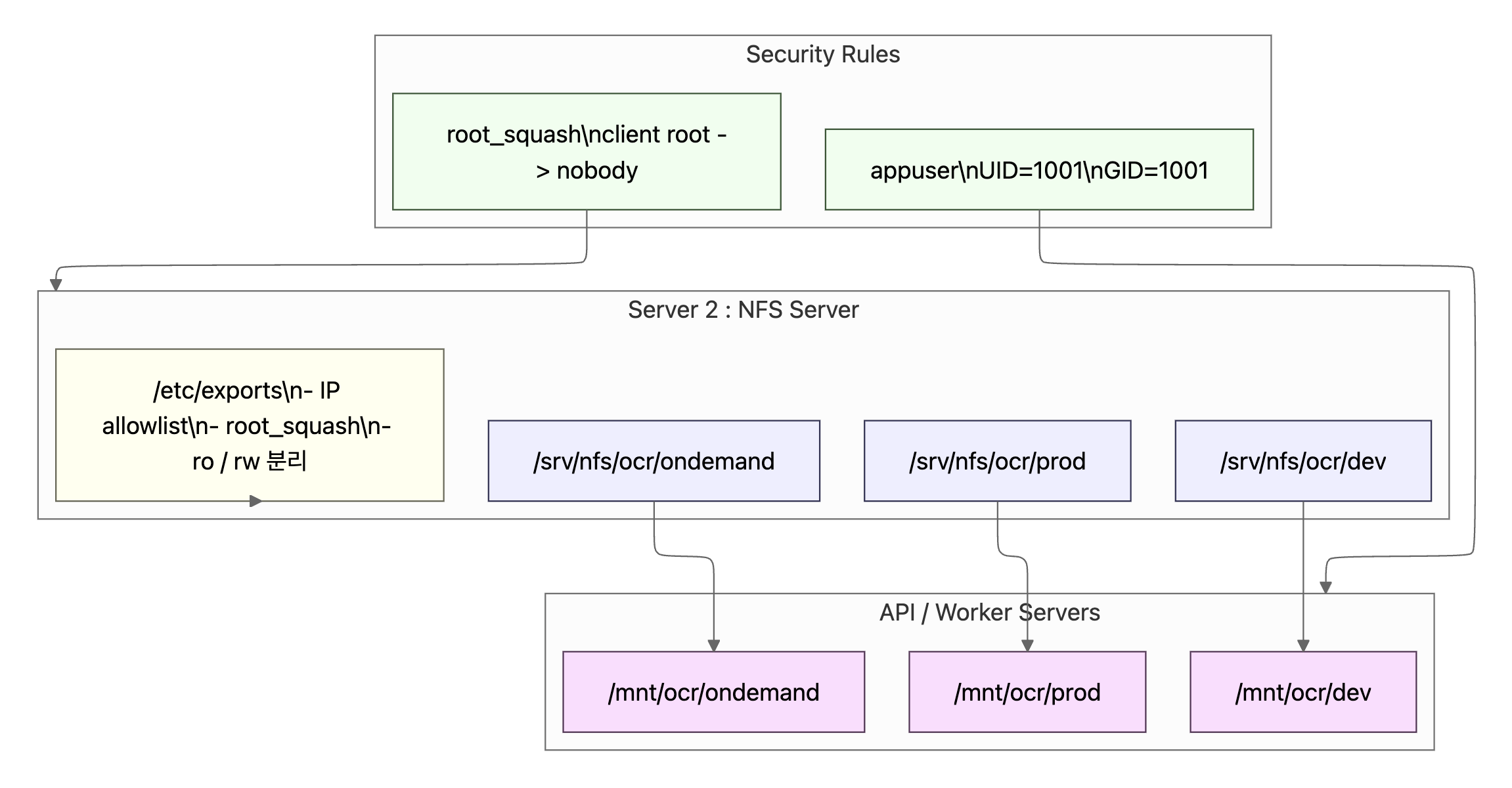 위 구조에서 중요한 점은 파일을 누가 소유하느냐가 아니라, 어떤 UID/GID로 접근하느냐입니다. 모든 서버와 컨테이너의 실행 유저를 UID 1001로 통일하고, NFS에서는 root_squash 옵션을 통해 클라이언트의 root 권한을 제거함으로써 공유 스토리지 환경에서도 최소 권한 원칙을 유지할 수 있도록 설계했습니다.