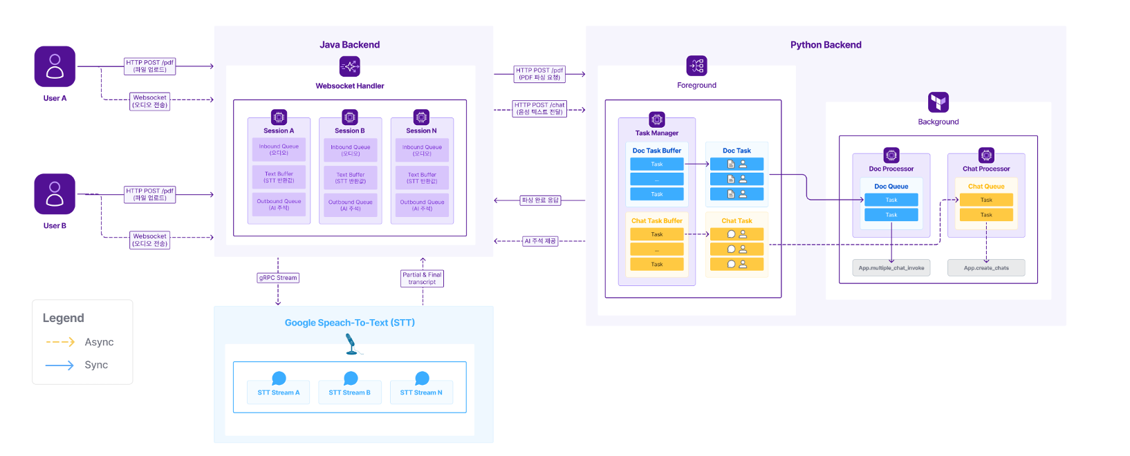 이번 글에서는 그 연장선에서, SpeakNote에서는 병목을 줄이고, 병목이 전체 시스템으로 확산되는 것을 막기 위해 어떤 아키텍처를 선택했는지를 실제 설계를 기준으로 설명하고자 합니다.