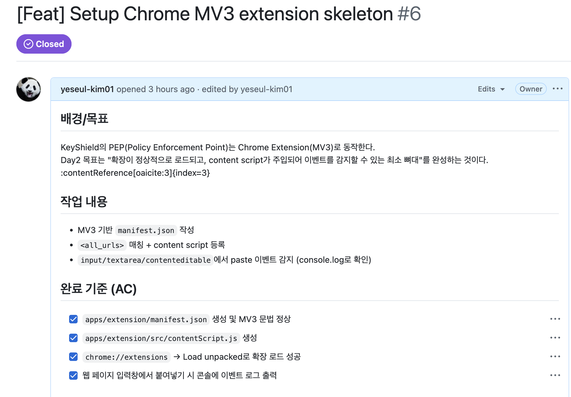 즉 Chrome Extension 기반 PEP(Policy Enforcement Point)의 최소 기능을 완성한 시점까지입니다.