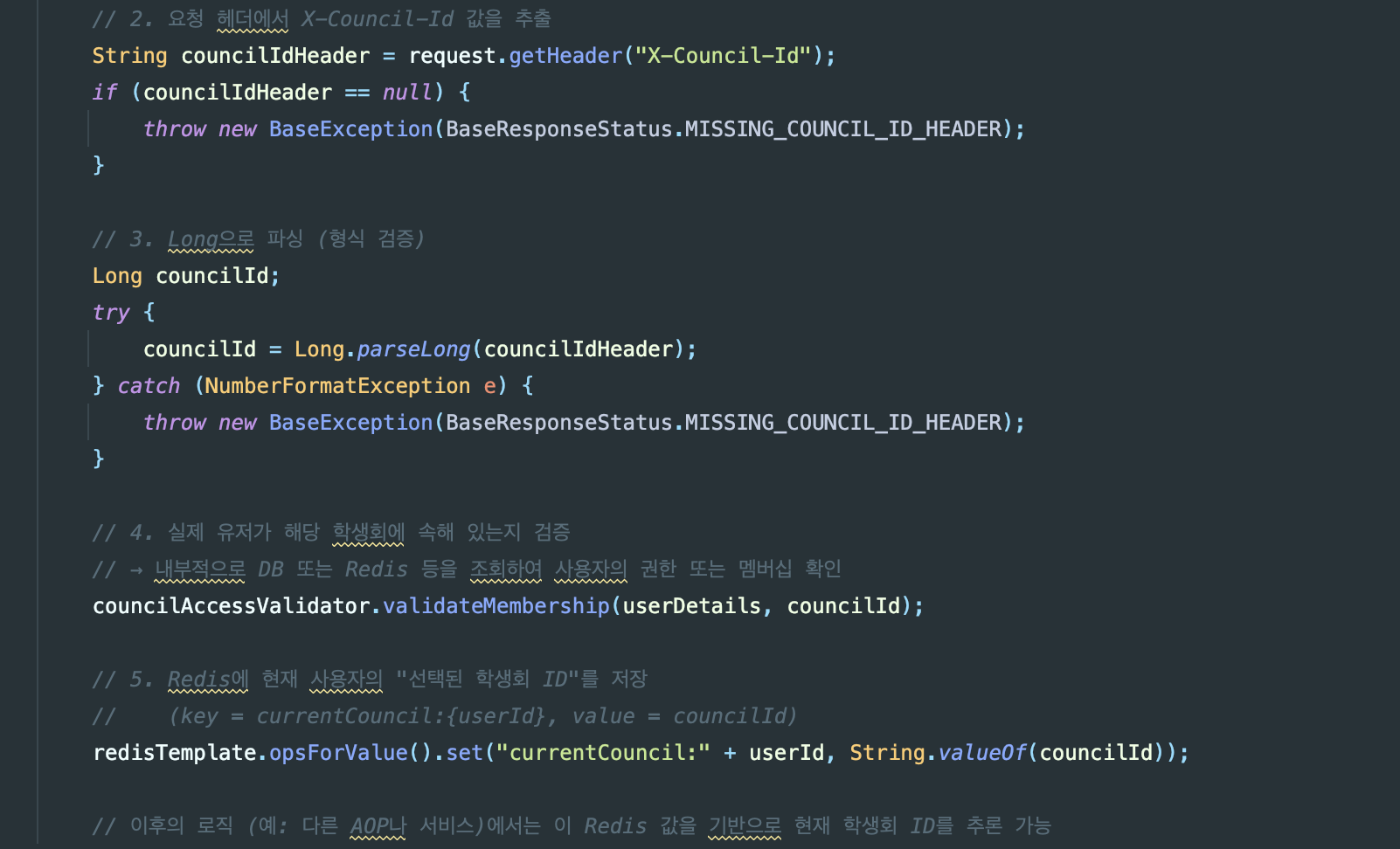 X-Council-Id)에 학생회 ID가 있는지 확인한다. - [중요] 해당 유저가 현재 선택한 학생회(Redis)와 헤더의 ID가 일치하는지 검증한다.